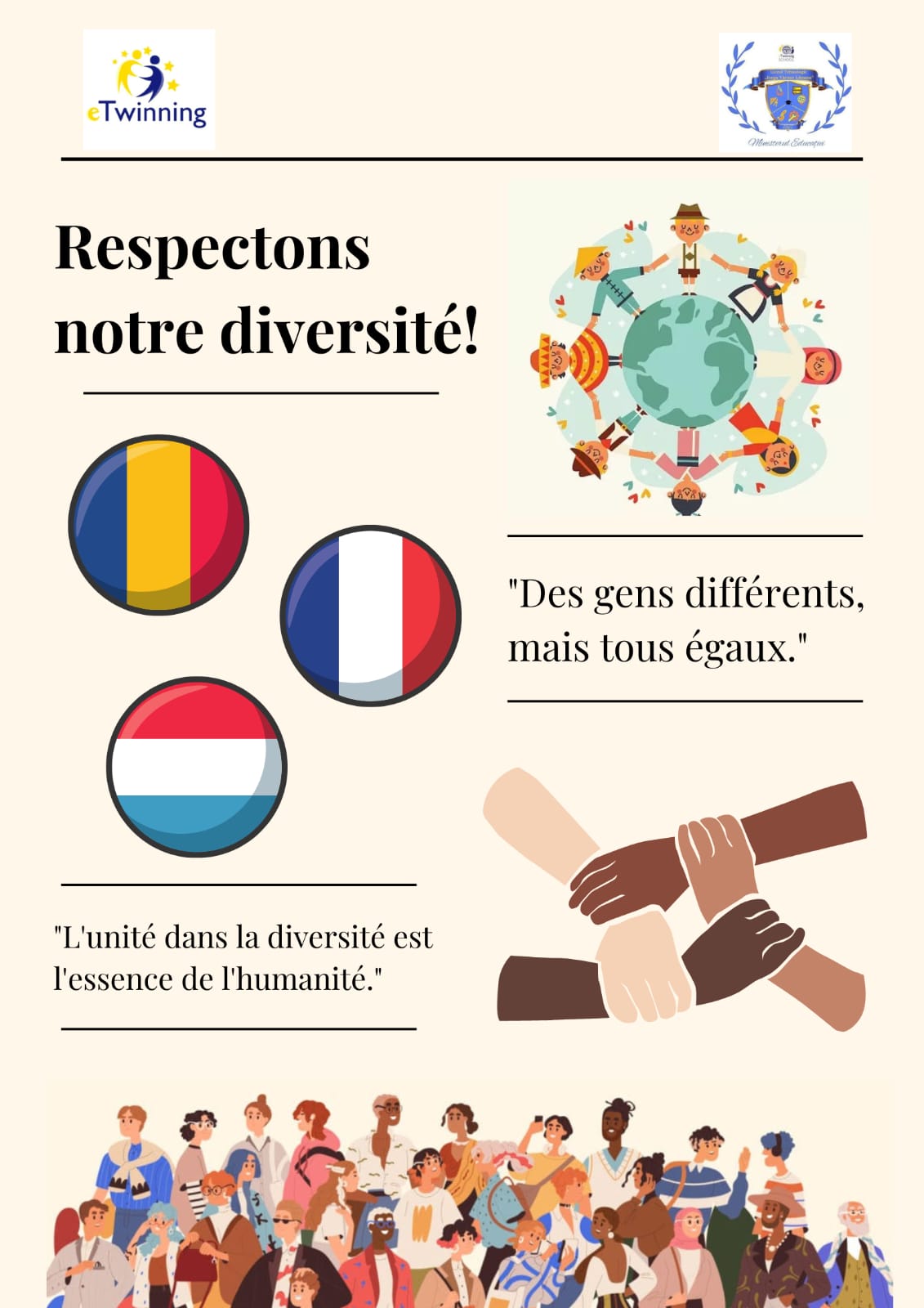 Dans un monde où la diversité nous unit, le respect est primordial. Notre projet veut mettre en évidence les bonnes manières et le respect envers tous les citoyens de ce monde, tout en tenant compte du fait que nous avons des croyances différentes et des règles culturelles diverses. Nous voudrions apprendre à nos élèves, la génération de la technologie, que le respect s’offre même si l’autre est différent et que comprendre ne signifie pas nécessairement être d’accord, mais respecter les valeurs des autres.